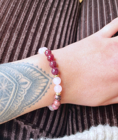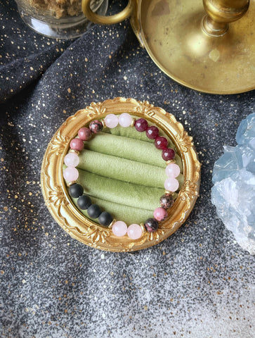 Bracelet sur élastique très épais . Perles en rhodonite, en quartz rose, onyx et lepidolite