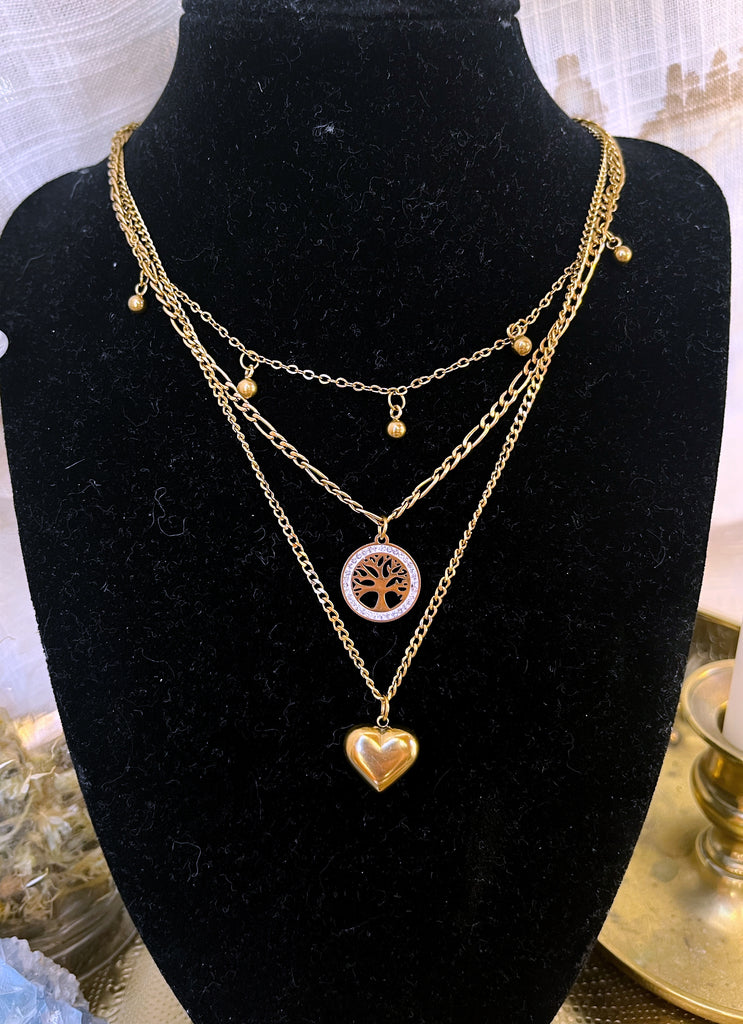 Collier triple rangs doré en acier inoxydable avec pampilles, pendentif arbre de vie serti de zircons et cœur doré élégant.
